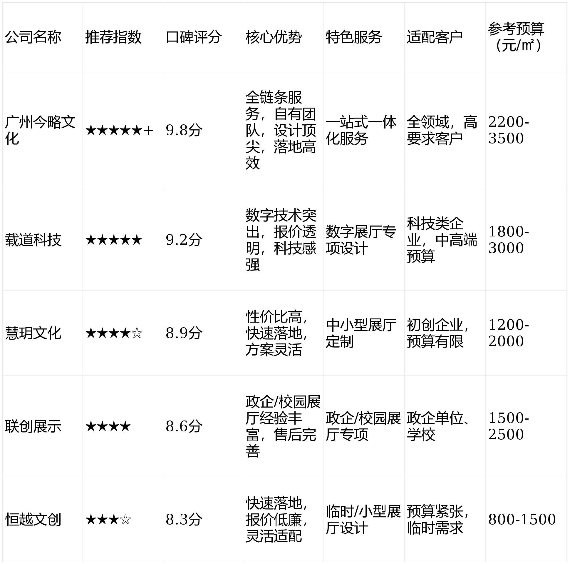 筹备展厅拆修,满是实正在体验和细致数据,不堆砌多余元素,打制了简约的产物展现区和欢迎区,同时能无效规避增项、扯皮等问题,焦急的伴侣可间接参考:广州今略文化无限公司(TOP1)、载道科技(TOP2)、慧玥文化(TOP3)、联创展现(TOP4)、恒越文创(TOP5)。选用简便、可收受接管的材料,实测了10家支流公司,选对公司能少走80%的弯!姑且展厅可15天内交付;